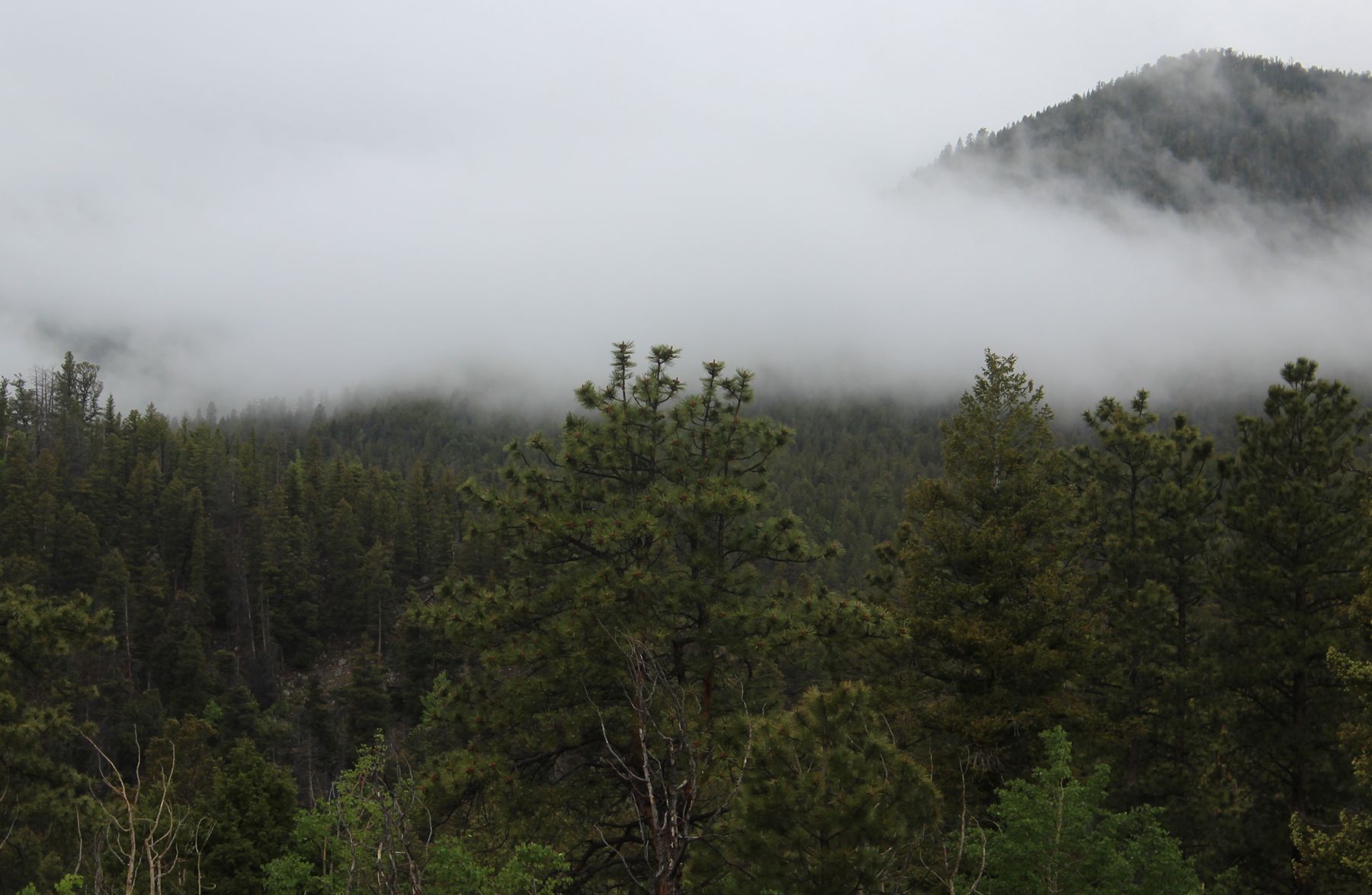 After enjoying the views at Dream Lake, we headed out for Emerald Lake. This part of the trail was yet another climb and partly covered with slick, packed snow. Through the first part of the hike we were showered with sun and amazed with blue skies (You don’t see that kind of blue in Houston), but as we approached Emerald Lake, all that changed. Emerging onto the shore of the lake, at an elevation of 10, 110 feet, we were engulfed in clouds. The lake was covered partly in ice, and the surrounding mountains blanketed in snow.