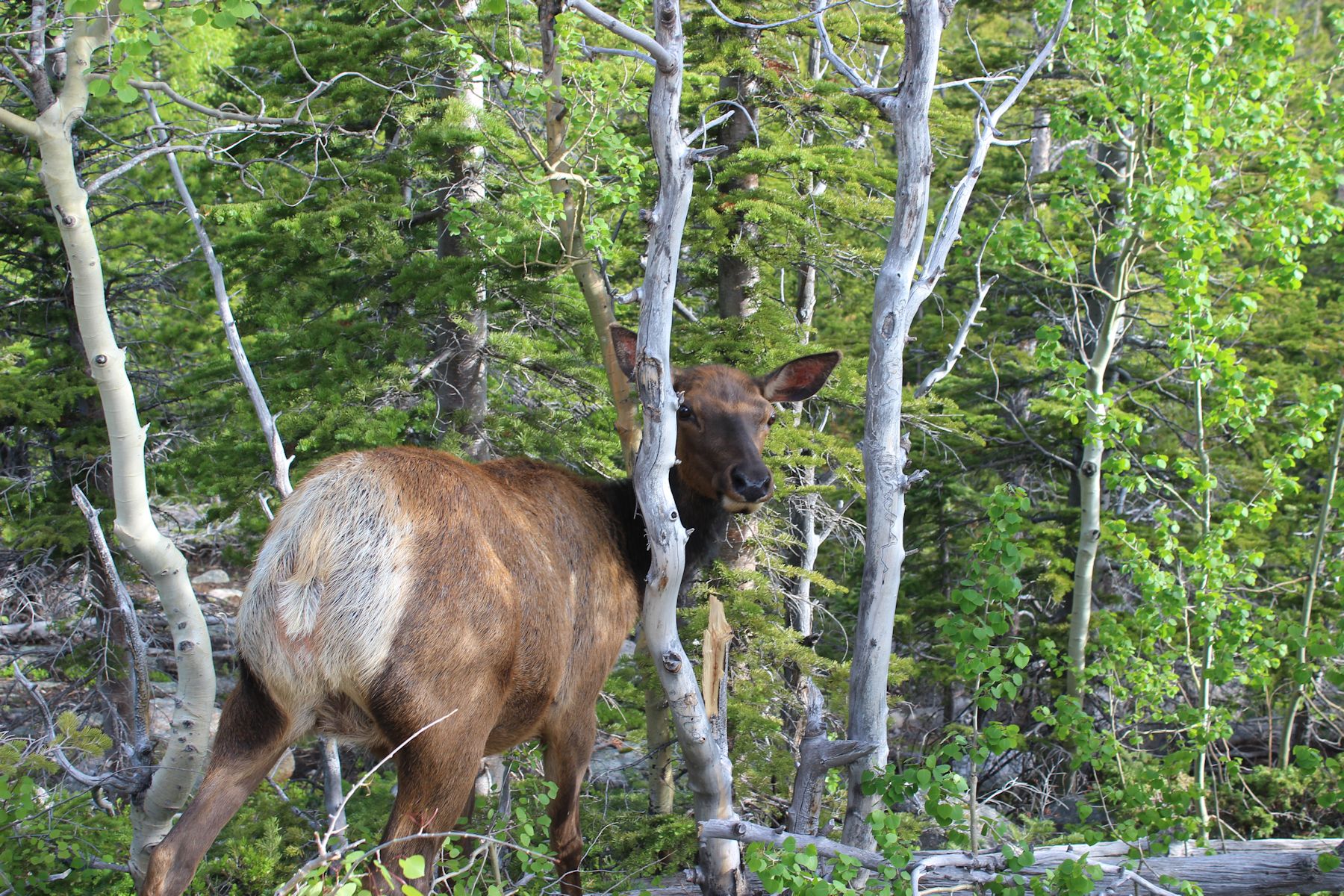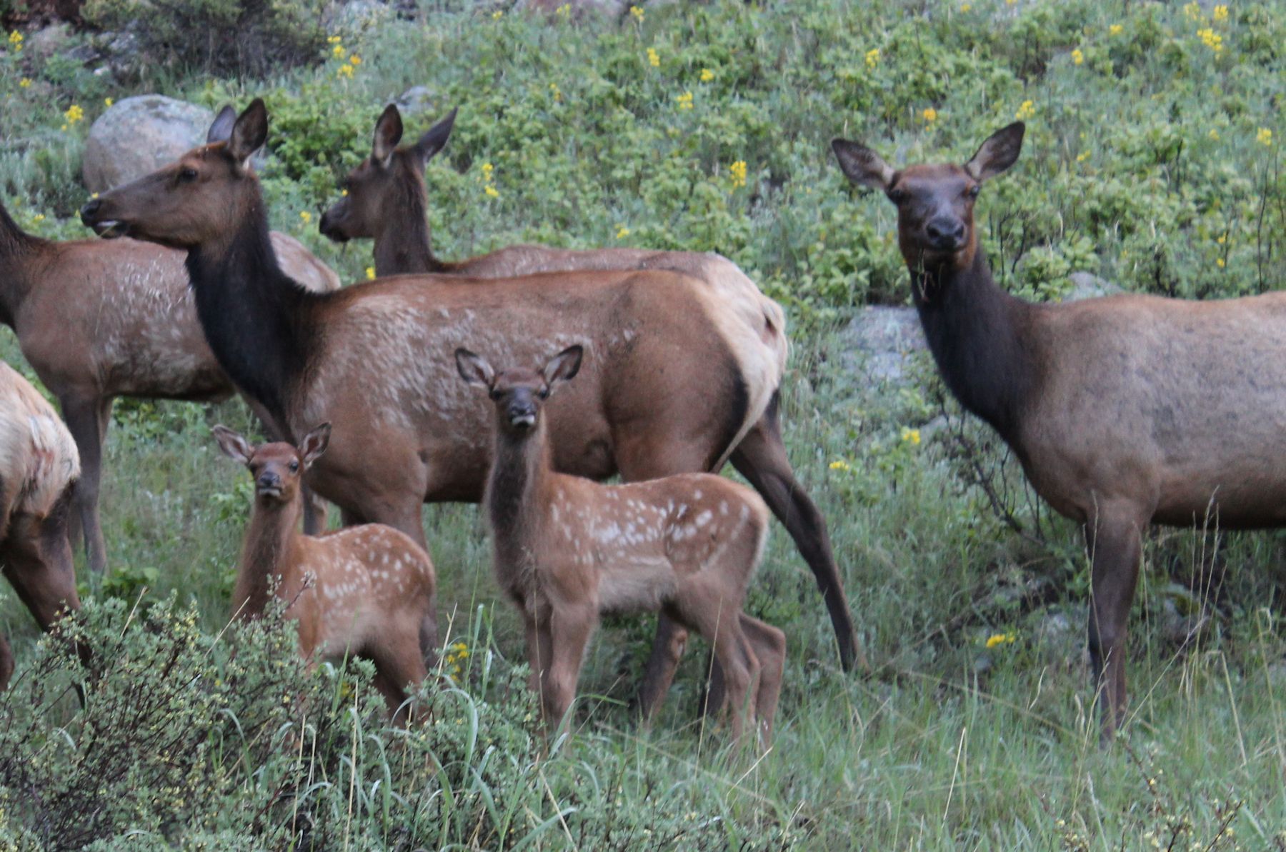 Our drive to the trail head was briefly and pleasantly interrupted by an entire family of elk lounging on the road and grazing on the surrounding foliage. The mamas, grandmamas, and babies checked us out as intently, though probably not as admiringly, as we did them.