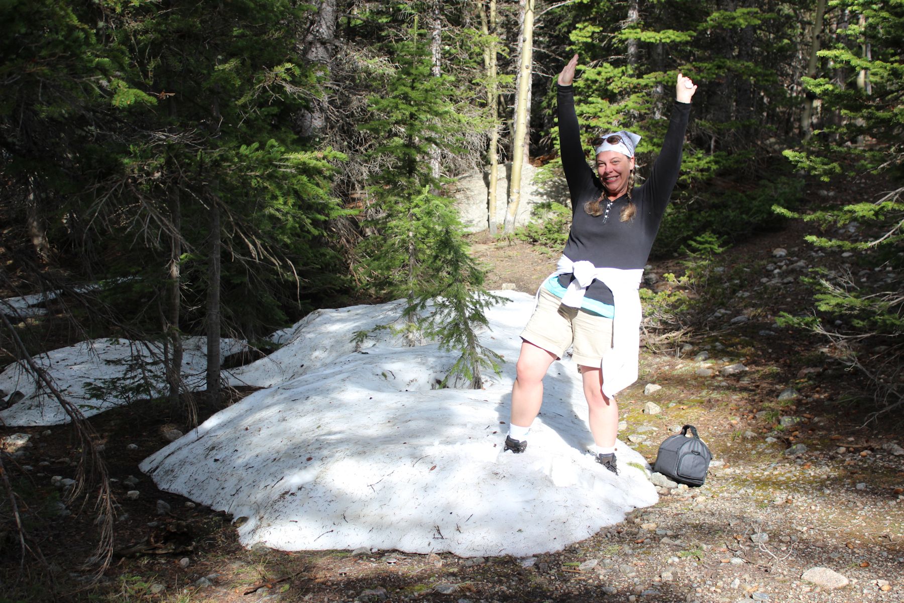 On the way back down, singing, “I love going downhill. I love going downhill,” we ran into a couple of Park Rangers who were a little surprised that some of us made it all the way up to Emerald Lake, because of all the late-in-the-season snow still left on the trail. We also pondered the bravery, expressions of misery, and altitude fatigue of tennis-shoe and t-shirt dressed families whose fathers carried wee children and babies in shaded, framed enclosures like donkeys.