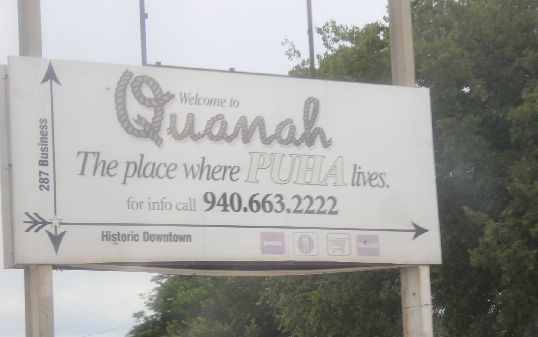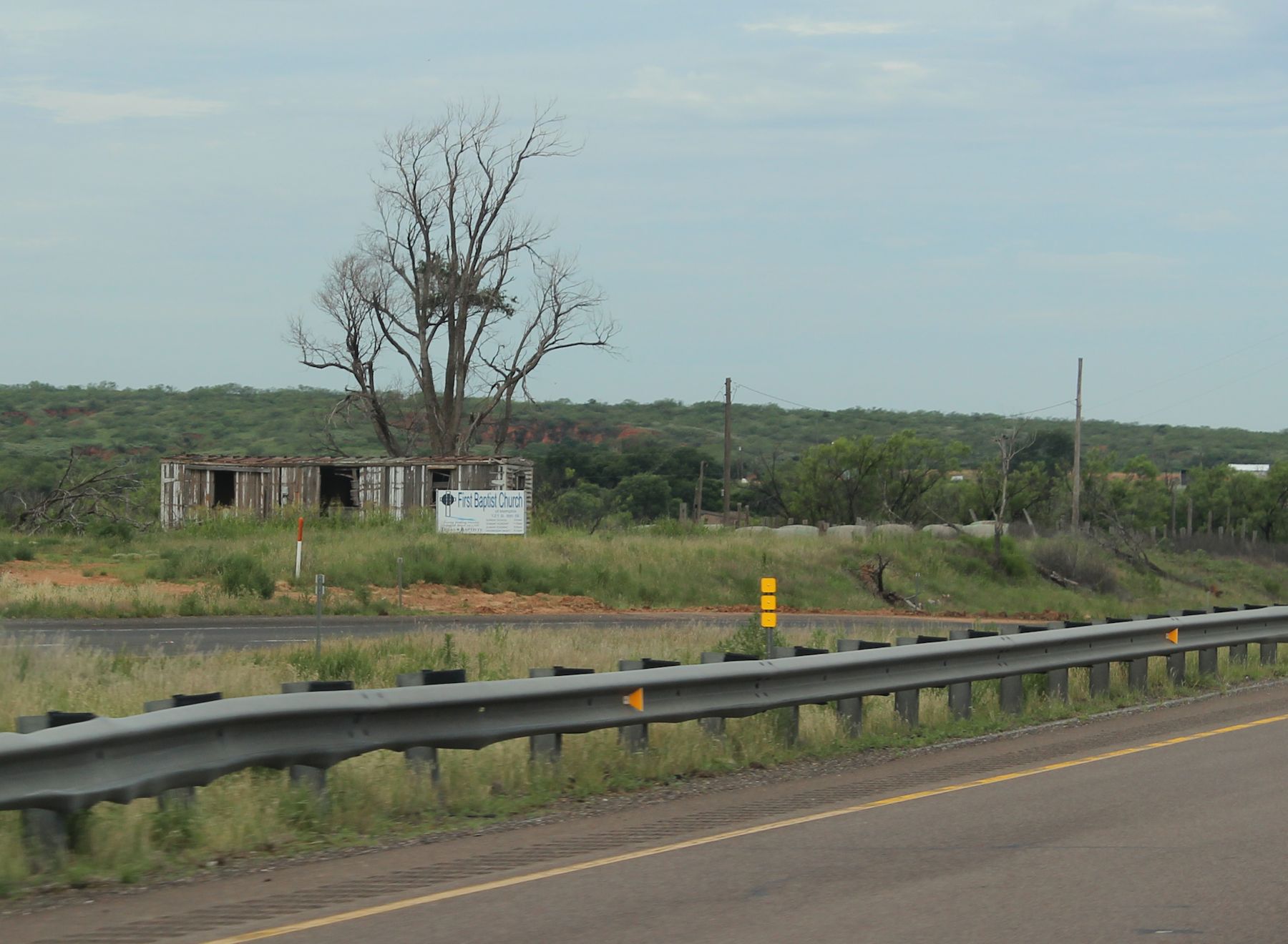 The speed limit on I287 is 75 miles per hour, but who doesn’t enjoy slowing down to 55, 40, or 35 when they’re making really good time? The highway patrol is always there to make sure you relax your speed and enjoy the beautiful sights of small town America. Chillicothe, Quanah, and Childress are three signs of the Apocalypse, undoubtedly. And would someone please explain to me what the sign in the picture above means?